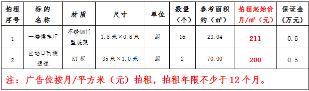 (四)拍租鎮(zhèn)雄縣開元商業(yè)物業(yè)服務(wù)有限公司以勒高鐵站站前廣場各類廣告位使用權(quán),詳見下表: